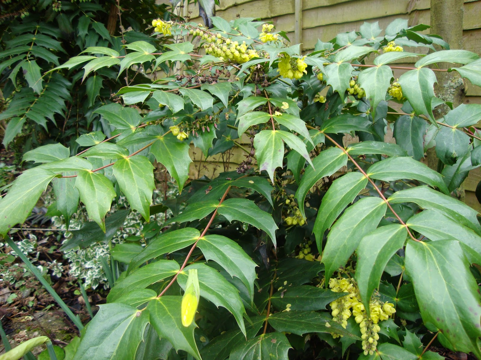 Zimzeleni žbun visine do 2m. Grane su bez trnova. Listovi su neparno perasto složeni, spiralno raspoređeni. Listići kožasti, po obodu nazubljeni. U složenom listu ima 5-9 listića. Listovi su sjajni. Tokom leta su tamnozelene boje, a u zimu dobijaju bronzanu nijansu. Cvetovi su u grozdovima, žute boje. Cveta mart-jun. Cvetovi su mirisni i privlače insekte. Plodvi su bobice tamnoplave boje sa pepeljkom. Bobica dozreva u jesen. Raste lagano.